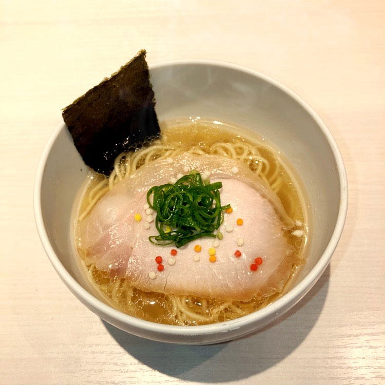 鴨ガラ、鶏ガラ、豚の背ガラ、大山鶏の丸鶏の清湯スープに独自配合の塩のかえしに小麦香る全粒粉の麺または手もみ麺を加えた、トリュフとマッシュルーム香る風味豊かな塩らーめん。